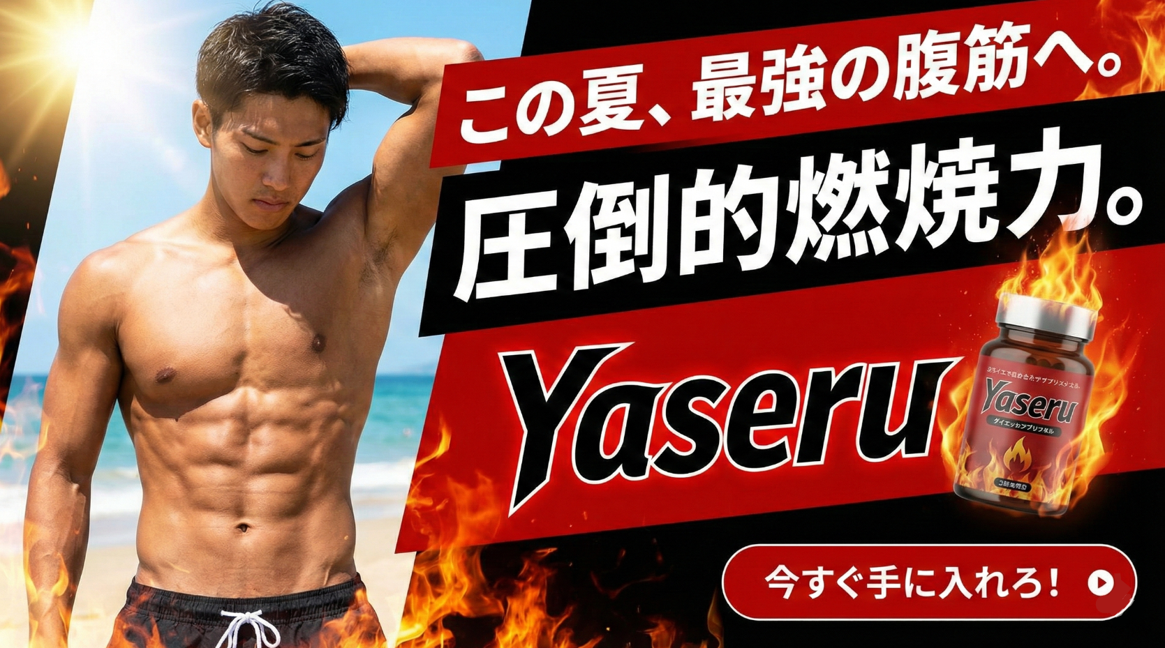 Bパターンとして「夏の海に向けて、短期間で腹筋を割りたい20代の男性」を設定します。この場合、「筋肉質なモデル」「力強い黒と赤の配色」「圧倒的な燃焼力」といった訴求が求められます。