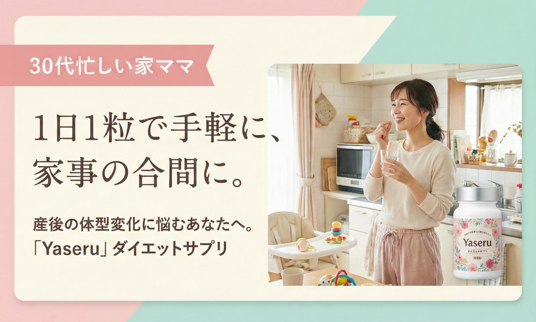 Aパターンとして「産後の体型変化に悩む、時間がない30代の専業主婦」を設定します。この場合、バナーには「1日1粒で手軽に」「家事の合間に」といったコピーが有効です。ビジュアルも、優しいパステルカラーや日常の風景を取り入れると親近感が湧きます。